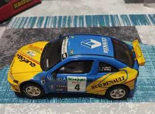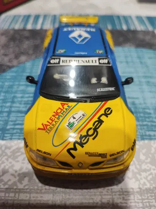 Coche de Scalextric modelo Renault Megane con decoración Valencia. - Réplica detallada del coche de carreras. - Diseño llamativo en amarillo y azul. - Incluye patrocinadores como Elf y Belson.