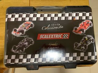 Set de 8 coches de Scalextric de la Edición Coleccionista Grandes Campeones. Edición limitada. - Incluye modelos como el ING Renault F1, Ferrari F2004, BMW Sauber F1 y McLaren F1 1998. - Presentado en un maletín. - Diseño con temática de carreras.