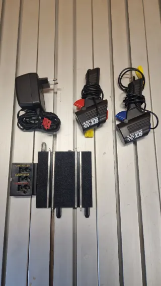 Set de accesorios para Scalextric Compact. - Incluye transformador de corriente. - Dos mandos de control con cable. - Pista de conexión (le falta una patilla, pero no afecta a su funcionamiento)