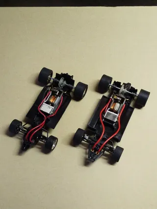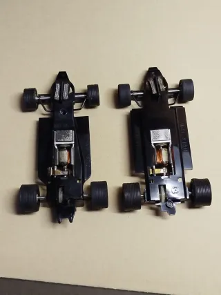 Chasis de coche Scalextric listos para montar. Incluyen motor y ruedas. - 2 Chasis negro.(Lotus y Ligier). - Cables de conexión rojos. - Ruedas delanteras y traseras. Funcionan.