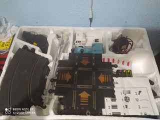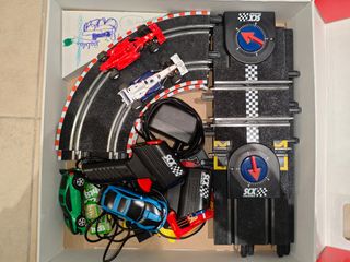 Circuito que contiene 10 curvas, 12 rectas , 2 mandos,1 transformador y 2 coches / Accesorios que van en el lote del circuito: 12 coches, 1 camión y 2 transformadores y 4 mandos, 1 trainer y piezas de coches