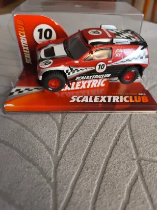 Coche de colección Scalextric Club, edición especial del año 2010. Presenta un diseño deportivo en rojo, blanco y negro con detalles a cuadros y el número 10. - Modelo: Scalextric Club - Edición: Especial 2010 - Diseño: Rojo, blanco, negro y cuadros - Dorsal: 10