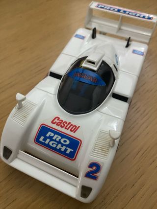 Coche de slot Scalextric Jaguar SRS2 en color blanco. - Diseño deportivo. - Detalles de patrocinadores como Castrol y Pro Light. - Número 2 visible en el frontal.