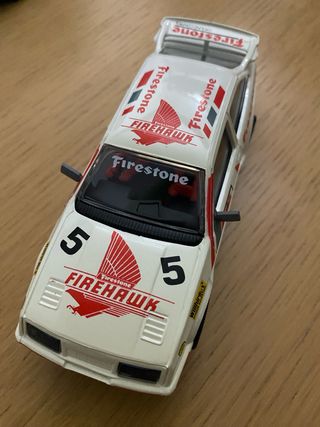 Coche de slot Scalextric Ford Sierra con decoración Firestone. - Réplica detallada del Ford Sierra. - Diseño con patrocinio Firestone y Firehawk. - Número de dorsal 5.