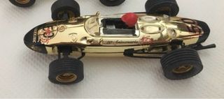Coche de Scalextric edición especial del 50 aniversario de Ferrari. Modelo deportivo con acabado dorado brillante. - Réplica del Ferrari 50 aniversario. - Detalles en negro y rojo. - Número 50 en la parte frontal. - Marca Scalextric.