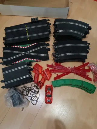 Conjunto 138 pistas para Scalextric de diferentes tramos: Curva corta 5u Curva media 7u Curva larga 52u Recta corta 6u (una con pequeña falta en el lateral) Recta media 10u Recta larga 50u Recta larga linea meta 4u Recta larga Chicane 2u Recta larga Cambio Vía 2u *Cruce 1 (hay que reparar soldadura, se incluye sin coste) *Quitamiedos largo 17u