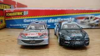 Se venden dos coches de Scalextric y un circuito Acrópolis. Están en buen estado. - Incluye dos coches de rally: Peugeot 206 y Ford Focus. - Un circuito Scalextric Acrópolis. - También se incluye una curva superdeslizante.