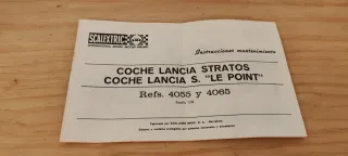 Instrucciones de mantenimiento para el coche Scalextric Lancia Stratos Le Point. - Referencias: 4055 y 4065. - Escala 1/32. - Fabricado por EXIN-LINES BROS. S. A. Barcelona. - Sistemas y modelos protegidos por patentes nacionales y extranjeras.