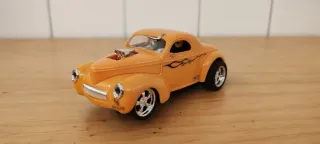 Coche de Scalextric en color naranja con detalles de llamas y motor expuesto. - Diseño deportivo. - Ruedas traseras anchas.