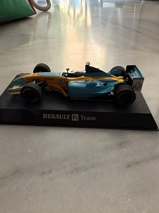 Réplica de coche de Fórmula 1 del equipo Renault 2003 scalextric Fernando Alondo - Diseño detallado del coche de carreras. - Base expositora con el logo Renault F1 Team.