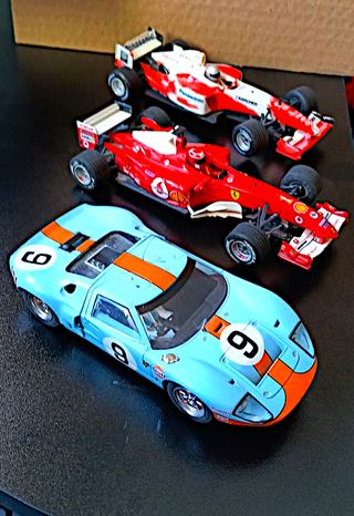 ¡La historia del motor en la palma de tu mano! Desde la gloria eterna del Ford GT40 Gulf en Le Mans hasta el dominio de Ferrari y Toyota en la F1. Tres leyendas listas para jugar o brillar en tu vitrina. Ford GT40 Mk I (Gulf). Es uno de los modelos más icónicos del automovilismo, famoso por ganar las 24 Horas de Le Mans Ferrari F1 (Marlboro)- Michael Schumacher. Monoplaza de Fórmula 1 de la Scuderia Ferrari de principios de los años 2004, pertenece alampeón del mundo de esa temporada, Michael Schumacher. Toyota TF105 F1 (Panasonic). Compitió en la temporada 2005 de Fórmula 1 con pilotos como Jarno Trulli.