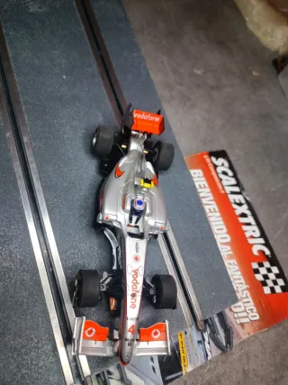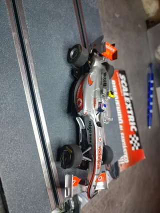 Coche de Scalextric a escala 1/32, modelo McLaren Button. Nuevo a estrenar - Réplica detallada del coche de competición. - Diseño plateado con detalles en naranja y rojo. - Patrocinado por Vodafone y Mobil 1.
