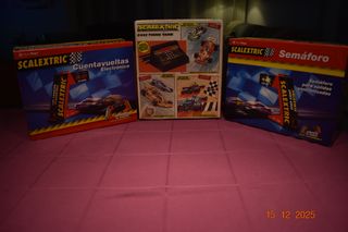 Conjunto complementos Scalextric Semáforo y Cuentavueltas electrónicos. Nuevos sin estrenar y en su caja Scalextric C452 Tink Tank computadora gestión carreras. En muy buen estado en su caja original 2 mandos Scalextric Pro nuevos en su bolsa. Resistencia 45 ohm y dos resistencias 20 Ohm. opcionales incluidas Recta toma corriente. Se añade transformador Tecnitoys de regalo 6 rectas Standard Triang originales en su caja 2 rectas 1/4