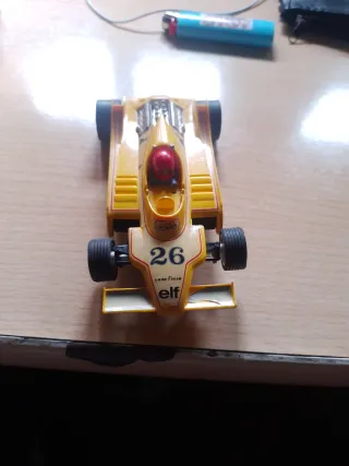 Coche de Scalextric de Fórmula 1 en color amarillo. Presenta el dorsal número 26 y patrocinadores. - Diseño de coche de carreras. - Detalles de patrocinadores como Goodyear y Elf. - Ruedas negras.