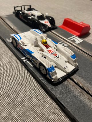 Dos coches de slot Scalextric, uno blanco Audi R10 con dorsal 14 ycon detalles azules (le falta el alerón) y otro negro Peugeot 908 HDI FAPcon detalles blancos con dorsal 9 y patrocinio TDI (Tiene el chasis por debajo algo roto) Una pista con conexión mandos. Transformador original. 3 mandos.