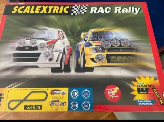 Circuito de Scalextric RAC Rally con dos coches y semáforo. - Incluye transformador con Super Power Boost. - Semáforo con salida controlada. - Dos coches: Ford Focus WRC y Seat Cordoba WRC. - Longitud de pista: 6.49 m. - En funcionamiento.