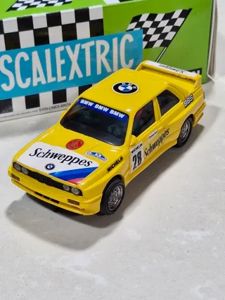 Coche de slot Scalextric BMW M3 E30 de la marca Schweppes. - Modelo de competición. - Decoración amarilla con detalles de patrocinadores. - Incluye dorsal 28.