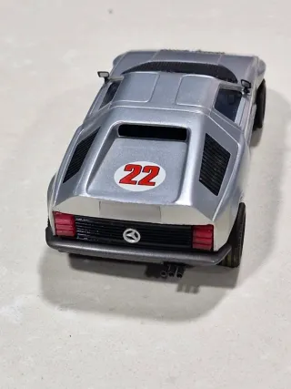 Coche de colección Scalextric en color plata con detalles deportivos. - Diseño inspirado en competición. - Número 22 en color rojo. - Logo de Mercedes-Benz en el frontal.