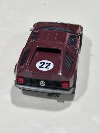 Coche de slot Scalextric con diseño deportivo en color burdeos. - Detalle de dorsal 22 en blanco. - Réplica del Mercedes. - Incluye el logo de Mercedes.