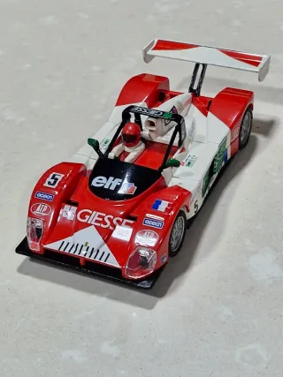 Coche de slot Scalextric con decoración Peugeot. - Réplica de coche de competición. - Color dorado brillante. - Detalles de patrocinadores. - Figura de piloto incluida.