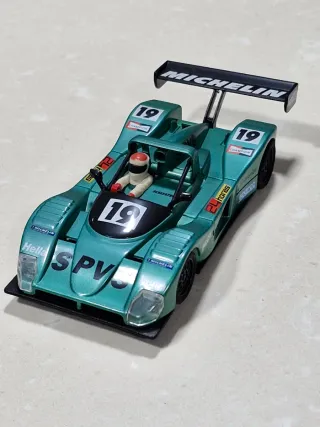 Coche de Scalextric con diseño de carreras en color verde. - Detalle del número 19 en el frontal y alerón. - Inscripción SPVS en la parte delantera. - Neumáticos negros. - Ala trasera con MICHELIN.