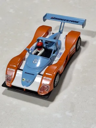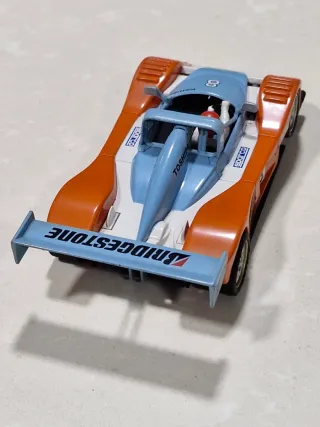 Coche de Scalextric con un diseño deportivo y llamativo. - Carrocería principal en color naranja. - Detalles en azul claro en la cabina y alerón. - Número 8 visible en la parte frontal. - Inscripción BRIDGESTONE en el alerón.