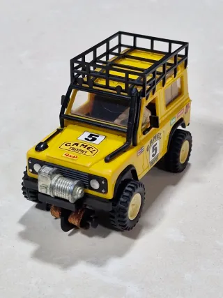 Coche de slot Scalextric con temática Camel Trophy. - Color amarillo. - Detalle de Camel Trophy y número 5. - Incluye baca y cabrestante.