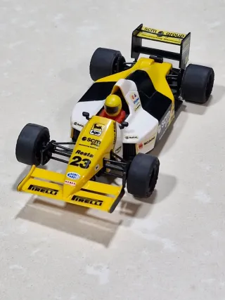 Réplica de coche de Fórmula 1 de Scalextric, con un diseño llamativo en amarillo y negro. - Detalle del dorsal número 23. - Logos de Pirelli, Agip, SCM Group y Magneti Marelli. - Piloto con casco amarillo.