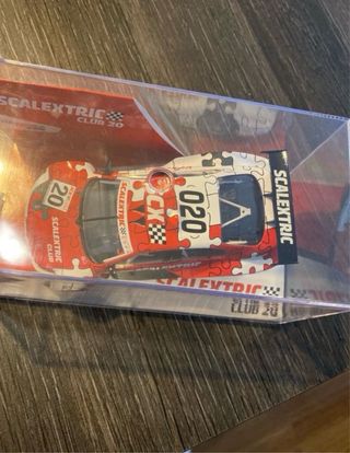Coche de slot Scalextric Club 20, edición 2020. - Diseño puzzle rojo y blanco. - Número 20 en las puertas y techo. - Incluye alerón negro. Sin abrir