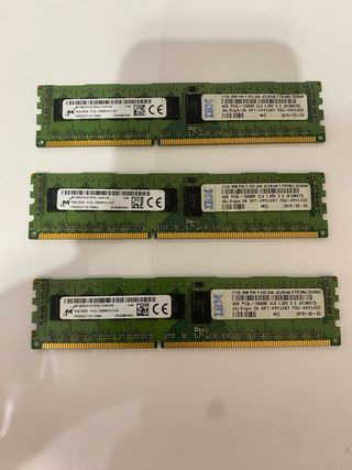 Se venden dos módulos de memoria RAM IBM de 16GB cada uno. FRU: 46W0670 - Capacidad total: 32GB (2x 16GB). - Tipo de memoria: DDR3 ECC - Velocidad: PC3-14900R. - Latencia: CL13. - Voltaje: 1.5V. - Fabricante: IBM. - Origen: China y Filipinas. FRU de IBM idéntico, trabajando juntas sin problemes en el mismo servidor. 1 módulo, 20€ 2 módulos, 55€ Consultar mi perfil para hacer lotes