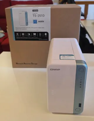 NAS QNAP TS-251D de 2 bahías, en muy buen estado y plenamente funcional. Incluye caja original y accesorios. Equipo ideal para backup centralizado, servidor multimedia, virtualización ligera o laboratorio doméstico/profesional. Especificaciones clave: - Modelo: TS-251D - 2 bahías para discos SATA (no incluidos) - 2 GB RAM - Puerto HDMI (uso como media center o escritorio ligero) - CPU Intel - USB 3.0 frontal - Sistema operativo QTS - Compatible con RAID 0/1 Equipo fiable, estable y muy versátil. Se vende por actualización de infraestructura.