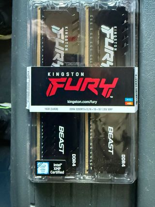 Kit de dos módulos de memoria RAM Kingston FURY Beast. - Capacidad total: 16GB (2 x 8GB) - Tipo de memoria: DDR4 - Velocidad: 3200MT/s - Latencia: CL16-18-18 - Voltaje: 1.35V - Perfil: XMP