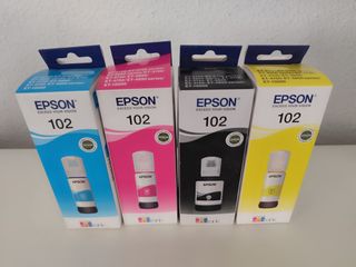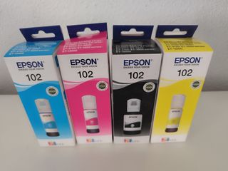Lote de cuatro botellas de tinta Epson Ecotank 102. Nuevas a estrenar, en su embalaje original sin abrir. - Botella de tinta Cyan. - Botella de tinta Magenta. - Botella de tinta Negra. - Botella de tinta Amarilla.