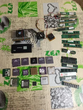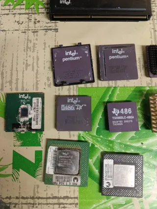 Conjunto de componentes electrónicos vintage, incluyendo microprocesadores y módulos de memoria RAM. Se venden como estropeados aunque se desmontaron la malloria funcionando . Hay 282, pentium 100,133, pentium 2, 3, y 4, varios amd, celeron, 486, overdive, precio de todo el conjunto no se venden por separado