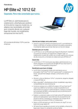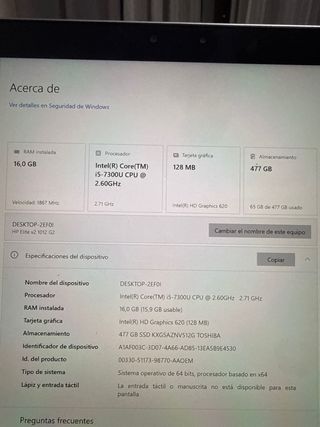 Ordenador portátil HP Elite x2 1012 G2. - Procesador Intel Core i5-7300U a 2.60GHz. - 16 GB de RAM (15,9 GB utilizables). - Tarjeta gráfica Intel HD Graphics 620 (128 MB). - Almacenamiento SSD de 477 GB (TOSHIBA). - Sistema operativo de 64 bits.