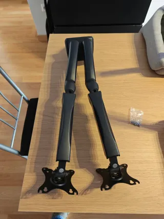 Se vende soporte doble para monitores, por cambio a pantalla única. - Construcción robusta y duradera. La estructura soporta dos monitores de hasta 15 kg, cada uno. - Diseño elegante y funcional. - Permite ajustar la posición de cada monitor de forma independiente. Precio original: 90€