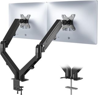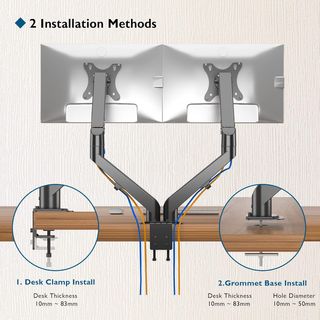 Este soporte para dos monitores ofrece una configuración versátil para tu espacio de trabajo. - Diseño de doble brazo. - Base con abrazadera para escritorio. - Acabado en negro y plateado.