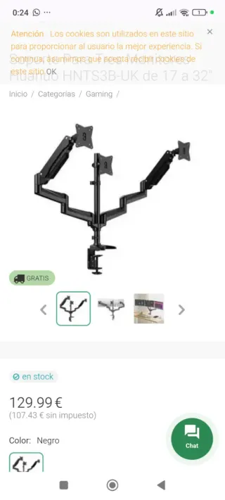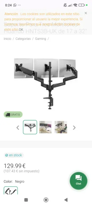 Soporte para tres monitores de 17 a 32 pulgadas. - Ajustable y robusto. - Diseño negro elegante. - Incluye pinza para fijación.