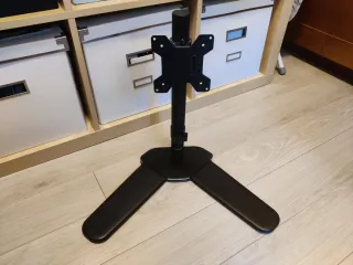 Soporte de mesa para pantallas o monitores de hasta 32 pulgadas. Su diseño permite una colocación estable en cualquier superficie. - Base con diseño de trípode. - Altura ajustable. - Placa VESA para fijación del monitor.