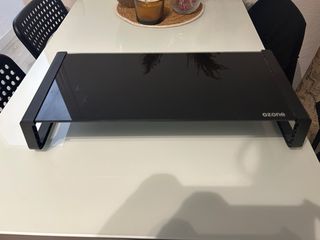 Eleva tu espacio de trabajo con este soporte para monitor. - Diseño moderno y elegante. - Superficie de cristal templado. - Patas de soporte estables.
