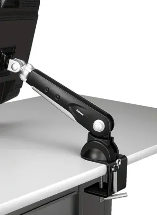 Brazo de soporte para monitor, con un diseño moderno y funcional. Permite ajustar la posición de tu pantalla de forma sencilla. - Acabado en color plata y negro. - Mecanismo de ajuste articulado. - Base de sujeción tipo pinza para escritorio. (Tive que seleccionar una marca pero no estoy segura que sea la corecta)