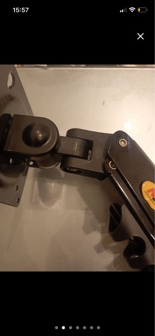 Soporte de escritorio con dos brazos para monitores. Permite ajustar la posición de las pantallas. - Construcción robusta. - Base con abrazadera para fijación a la mesa. - no se que marca es pero esta como nuevo -
