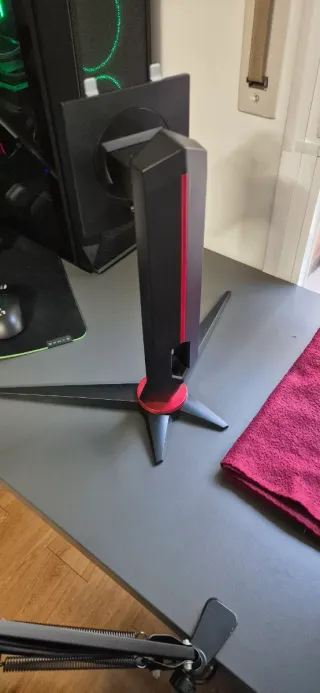 Soporte de pie para monitor gaming Acer. Diseño moderno con detalles en rojo. - Base con forma de V. - Mecanismo de ajuste. - Color negro y rojo. Soporte en perfecto estado. Compatible con varios modelos de monitores Acer. Vendo por 15 euros no negociables. Saludos