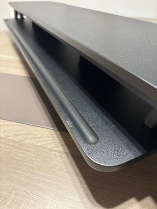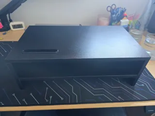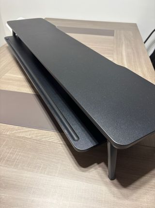Soporte para monitor en perfecto estado. Es de color negro, con estructura de madera y aluminio. - Elegante y funcional. - Dos niveles de altura. - Diseño moderno. - Soporte para movil o tablet.