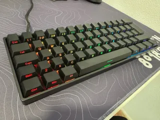 Teclado wired o alámbrico hot swap de 60 teclas moded con RGB. Tiene switches Vertex V1 y keycaps de pbt blancos y stabilizers Durock V3. Además tiene un plate de poron que amortigua el ruido y el tape mod. Se incluye cable de alimentación usb c, extractor de keycaps y otros dos plates de espuma. Posibilidad de incluir 30 switches más Vertex V1. Tiene software descargable en la web oficial. 35 ya solo vale el teclado, oportunidad.