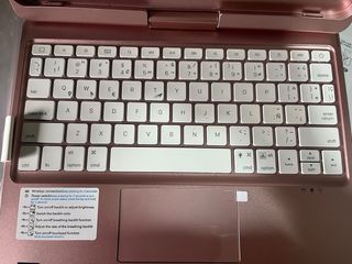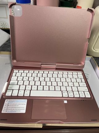 Funda con teclado para iPad, con diseño giratorio de 360 grados. - Acabado metálico en tono oro rosa. - Teclado integrado inglés/español (de membrana, silenciosas). - Incluye trackpad (desplazamientos a través de gestos). - Permite múltiples ángulos de visión (incluso usarlo solo como tablet). - Tres intensidades de iluminación del teclado (o sin iluminación) - 7 estilos de colores para el teclado. Conexión sencilla a través de Bluetooth para iPad de 10,9 y 11 pulgadas. NUEVO SIN USAR. Comprado en Amazon por 63,99€ (ver última foto).