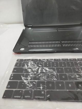 funda protectora rígida (carcasa dura) para portátil Apple MacBook Air de 13 pulgadas, incluye protector de teclado de silicona a juego. Detalles del producto: Estado: Nuevo a estrenar, en sus plásticos originales. Color: Gris oscuro translúcido (elegante y deja intuir el logo de Apple). Diseño: Consta de dos piezas (tapa superior e inferior) que se instalan con un simple "clic". La parte de abajo tiene ranuras de ventilación para evitar calentamientos y 4 patas de goma antideslizantes. COMPATIBILIDAD (¡Importante!): Compatible ÚNICAMENTE con los modelos de MacBook Air 13" cuyo número de modelo (grabado en la tapa de abajo del