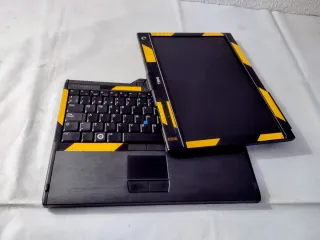 Ordenador y tablet Dell XT2 táctil, 12.1 pulgadas con un diseño personalizado. Windows 11, U9400 1,4 GHz L3, 5gb RAM DDR3, 128gb SSD M2, bluetooth, detector de huellas, SIM para teléfono, almacenamiento SD, 3 Usbs y uno cargador. En perfectas condiciones y rápido por SSD, con todos los drivers actualizados, batería carga poco, tiene que estar enchufado. Características en fotos. Especial para block de notas y recetas para la cocina. - Diseño con bandas reflectantes amarillas y negras. - Logo de Dell visible, cargador y lápiz táctil original incluido