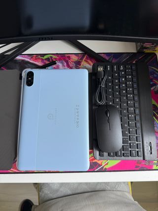 Tablet con pantalla de 10 pulgadas y diseño moderno. - Pantalla táctil. - Diseño multicolor. Trae funda y teclado inalámbrico, tb tienes cascos y adaptador para usb.