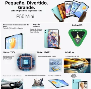Tablet Teclast P50 Mini, completamente nueva y sin abrir. - Pantalla de 8.7 pulgadas IPS. - Procesador de 8 núcleos. - 4gb + 8gb (ampliable) de RAM. - 128GB de almacenamiento ROM. - Batería de 5000 mAh. - Android 15. - WiFi 5. - Bluetooth 5.